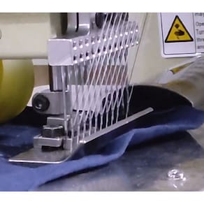 Elastiqueira plana de 12 agulhas com catraca, motor direct drive e um dispositivo zeromax frontal para aplicar fio de lastex para costurar franzidos ornamentais em blusas femininas, maiôs vestidos, fronhas e camisa infantil.