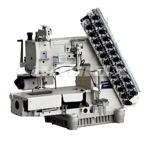 Elástiqueira Eletrônica Cilíndrica Direct Drive-eletronica pneumatica Posicionador de agulha, corte de linha, resfriador de agulha, levantamento de calcador e ajuste de comprimento de ponto fácil e rápido. Utiliza loopers independentes, permitindo mudar a posição das agulhas facilmente de acordo com aplicação da costura. Apropriado para aplicação de elástico, faixas refletivas, plissados, costuras de cós em bermudas e calças de sarja e brim e outros tipos de costura.