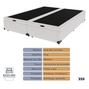 Bem-vindo(a) ao nosso catálogo! Apresentamos a você uma descrição completa sobre esse produto:O colchão Elegant com sua estrutura de molas ensacadas e espuma D26 de alta densidade, ele oferece suporte adequado para pessoas de até 150kg, tendo como garantia de máximo conforto o Pillow Euro. Uma camada a mais de aconchego!Colchão:Modelo: Elegant;Marca: Ortobom;Tamanho: King;Dimensões: 193x203x18cm; (largura x comprimento x altura)Conforto: Molas Ensacadas Espuma D26, Pillow Euro;Proteções: Antiácaro, antialérgico, antifungo, antimofo;Possui: Sistema No Turn, Fibra de bambu;Peso máximo recomendado: até 150Kg (por pessoa);Garantia: 03 meses; O sistema No Turn do Colchão Elegant torna sua manutenção muito mais prática e fácil, pois ele não precisa ser virado regularmente como os modelos tradicionais. Também é um produto sustentável. A fibra de bambu utilizada em sua composição é uma fonte renovável e amiga do meio ambiente.Qualidade Ortobom:O Elegant é produzido pela renomada marca Ortobom, conhecida por sua expertise em tecnologia do sono. Com anos de experiência no mercado, a Ortobom é reconhecida por oferecer produtos inovadores e de alta qualidade, que atendem às necessidades dos clientes mais exigentes.Base Box com Baú:Marca: KazaMix;Cor do Baú: Branco;Revestimento da Cama: Material Sintético;Material dos pés: Madeira;Estrutura: Madeira;Abertura: Pistão a gás;Peso máximo recomendado: até 150kg de cada lado;Altura do Baú: 32cm;Altura dos pés: 5cm;Altura total: 37cm;Garantia: 03 meses;Selo Ecologicamente Correto.Invista no seu sono e experimente o conforto e a qualidade!Atenção: Antes de finalizar sua compra, certifique-se de que as dimensões do produto sejam adequadas para serem transportadas pelos elevadores, portas, escadas e corredores de sua residência. Ressaltamos que não nos responsabilizamos pelo transporte do produto por meios específicos, como escadas, guinchos ou içamentos.