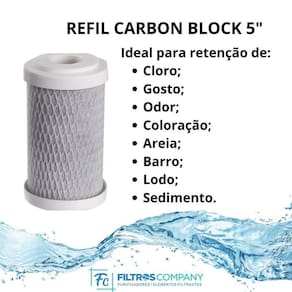 Filtro carbon block de 5 polegadas, ideal para chuveiro, pia e torneiras. Remove cloro, reduz gostos e odores, retém sedimentos. Melhora a qualidade da água para pele, cabelo e olhos.Bica móvel