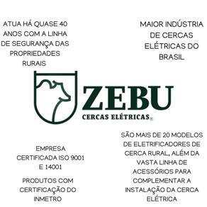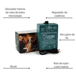 Eletrificador Cerca Elétrica Rural Ppcr Bivolt Zebu INFORMAÇÕES E ESPECIFICAÇÕES TÉCNICAS DO PRODUTO: Alimentação a luz: Automática 127 / 220 Vac; Raio de ação: 2.100 metros; Energia acumulada: 0,44 Joules; Energia liberada: 0,31 Joules; Tensão de saída sem carga: 9,0 kV; Intervalo entre pulsos (regulável): 1,1 a 2,1 segundos; Consumo de energia elétrica: 127 Vac: 0,014 kWh/dia; 220 Vac: 0,043 kWh/dia; Quantidade máxima aproximada de fios: 4.500 metros; Exige, no mínimo, 1 (uma) haste de aterramento.