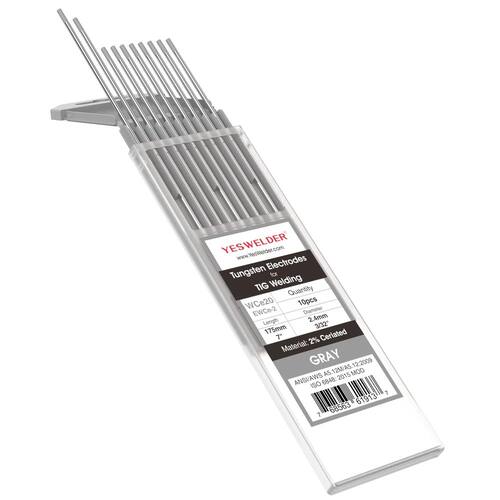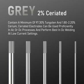 Eletrodo de tungstênio de soldagem TIG 2% Ceriado 3/32" x 7" (cinza, WC20/EWCe-2) pacote com 10 YESWELDER - Cinza-2% ceriado: contém um mínimo de 97,30% tungstênio e 1,80-2,20% de cério, eletrodos ceriados podem ser utilizados proficientemente em processos AC ou DC e têm melhor desempenho em soldagem CC em configurações de baixa corrente. - Certificação AWS: norma AMERICAN Welding Society AWS A5.12M/A5.12:2009. - DESIGN PERFEITO: Ao verificar a cor da embalagem externa, você pode distinguir rápida e facilmente a cor e o modelo dos eletrodos de tungstênio, economizando seu tempo e reduzindo a possibilidade de erros. - EMBALAGEM PROFISSIONAL: Embalagem a vácuo, sem oxidação, alcançando preservação por muito tempo. - Especificações: Diâmetro: 3/81.3 cm; Comprimento: 18 cm; Quantidade: 10 unidades.