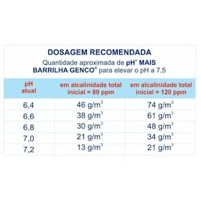 Elevador de ph para piscina barrilha ph+ mais genco 2 kg Barrilha elevador de ph para todos os tipos de piscinas ph mais genco 2 kg Por que usar este produto Produto em grânulos para elevar o ph.Utilizar quando o ph estiver abaixo de 7,2. Validade: 3 anos Disponível na embalagem: 2 kg Instruções de uso:1 a quantidade de phmais barrilha gencoa ser utilizada depende de vários fatores além do ph. Baseie-se nas quantidades indicadas na tabela das fotos do anúncio: 2 adicione o produto diretamente da embalagem à piscina ou dissolva-o num balde plástico com água da própria piscina. Distribua o produto ou sua solução sobre a superfície da água de maneira uniforme. 3 mantenha a filtração ou recirculação da água em funcionamento durante cerca de 30 a 60 minutos para homogeneizar a solução. 4 teste o ph após uma hora, para certificar-se de que está correto. 5 só permita uso da piscina 30 minutos após aplicação do produto.