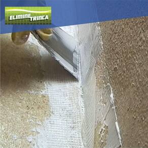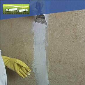 Abrir as rachaduras com raspador ou talhadeira em forma de V, alargando e aprofundando a mesma. Remover todas as partículas soltas e pó. Aplicar o Eliminetrinca com um pincel nas laterais e na base e em seguida preencher com espátula até nivelar com a superfície. Aguardar 24 horas e se ocorrer retração do produto, aplicar novamente Eliminetrinca, nivelando-o com a superfície. Em seguida aplique uma demão de Eliminetrinca na superfície de 5 a 6 cm de largura para cada lado do centro da rachadura. Coloque uma tela de poliéster e aplique novamente o Eliminetrinca sobre a tela nivelando com a superfície, deixando uma espessura mínima de 3mm nas duas demãos. No reboco, se necessário, faça um rebaixamento, para que a aplicação fique dentro do reboco, deixando que o nivelamento fique perfeito. Após 15 dias da última aplicação, poderá iniciar a aplicação de arssa decorativa ou pintura, desde que seja com as características do Eliminetrinca.