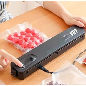 embaladora e seladora de alimentos doméstica a vácuo. Com ela você irá manter seus alimentos mais frescos e saborosos por muito mais tempo. Pode ser utilizada em peixes, vegetais, frutas, entre outros. Você pode economizar no supermercado comprando peças maiores de queijos e carnes, preparando suas próprias porções. A maquina funciona em dois modos: apenas seladora ou seladora a vácuo. O processo de embalagem a vácuo prolonga a vida do alimento, removendo a maior parte do ar da embalagem, evitando que o ar fresco escape para os recipientes selados, reduzindo a oxidação e ajuda a preservar o sabor e a qualidade do alimento. Ajuda também a inibir o crescimento de micro-organismo, como bolores, leveduras e bactérias. O processo de selagem é feito a partir do aquecimento com temperatura constante. Simples de utilizar, basta colocar o alimento na embalagem e apertar o botão da ação que deseja fazer, a luz verde, para selagem e vácuo ou a luz vermelha, quando querer apenas a selagem. Atenção para a utilização correta: