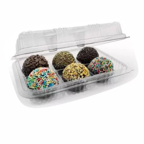 Embalagem Articulada com 6 Divisões com 10 un douplast Embalagem Articulada Embalagem com articulação e 6 divisórias; ideal para transportar 6 docinhos com muito mais facilidade e segurança. Dimensões aproximadas do produto: Comprimento: 144 mm x Largura: 116 mm x Profundidade: 39 mm Cavidade: 16mm aproximadamente Quantidade:10 Unidades. Composição:politereftalato de etileno. P.E.T. Marca: Douplast Embalagens Descartáve Ean: 7898644530273