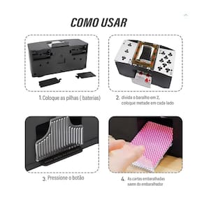 Informações Técnicas: Composição: Plástico e eletrônico. Capacidade: 2 baralhos. Comprimento: 21 cm. Largura 10 cm. Altura: 10 cm. Alimentação: 04 Pilhas AA (não inclusas) Peso total: 347 gramas.