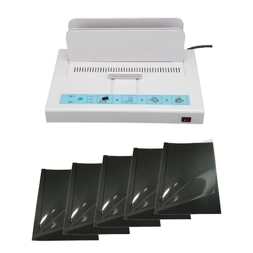 O sistema de encadernação térmica é composto de capas especiais e de uma máquina termo encadernadora. As capas possuem no lado interno do dorso um adesivo termoplástico especial. Quando aquecido pelo sistema adesão das folhas à capa, com alta resistência e rapidez. Encaderna até 500 folhas. Integrado design à prova de poeira. Desligamento automático para economizar energia.