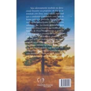 Sinopse "ENCONTRE SEU PROPÓSITO: 40 DIAS DE INTIMIDADE COM DEUS" é um devocional calorosamente oferecido como uma jornada espiritual prática e profunda, buscando conduzir os leitores à intimidade com Deus. As páginas contêm reflexões breves e sábias das Escrituras, destinadas a nutrir a alma e inspirar a meditação na Palavra de Deus. O propósito é auxiliar na experiência da presença divina diariamente, orientando na busca pela plenitude e paz que só Cristo pode oferecer. Com devoções curtas e impactantes, a obra acompanha os leitores em sua jornada espiritual, fortalecendo a fé e transformando atitudes. Ao permitir que o Espírito de Deus trabalhe durante esses 40 dias e além, a intenção é guiar os leitores em direção à paz e sabedoria tão desejadas.