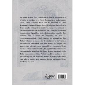 Se tomarmos os dois conjuntos de livros, o judaico e o cristão, o Antigo e o Novo Testamento, poderíamos dizer, como Sholem Asch, em O Nazareno, o Velho Testamento é masculino e o Novo é feminino. No Antigo, o Deus macho é vingativo, no Novo, o que predomina é o perdão feminino, o acolhimento das crianças, o cuidado dos doentes. O perdão é típico do feminino, o cuidar das feridas tem o rosto do feminino em nós. A contemporaneidade cristã insiste no masculino dos Velhos volumes e usa de modo malicioso e perverso a amabilidade feminina das boas novas. O Senhor da guerra e do juízo eterno, o incendiário e ciumento, Deus macho – Deus tem história –, foi claramente destronado pela empatia feminina. Do Deus de um povo único do Velho passamos ao Novo Testamento, Deus deixa de ser exclusivo para ser inclusivo. Essa é a parte da história que não se conta, a de que, no jovem nazareno, Deus mudou a sua face. Marca: ARTERA EDITORA