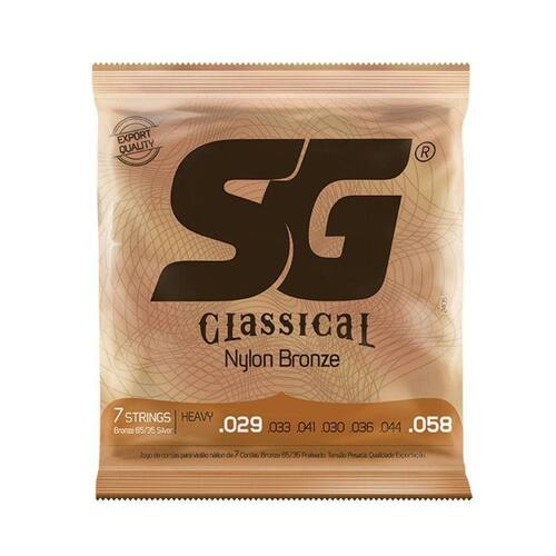 Encordoamento sg classical nylon bronze 7 cordasas cordas de tensão heavy, trazem um som quente, nítido, muito encorpado e brilhante. muito utilizadas em estilos musicais que tradicionalmente tem o violão como a mpb, a bossa nova, o samba e baladas pop. adequada para quem prefere aplicar maior pressão nas mãos. projetadas para trazer o maior equilíbrio tonal, sensação tátil suave e a dinâmica que todo violonista procura. esta linha é feita com náilon cristal, que traz agudos mais brilhantes e os bordões trazem cobertura de bronze 65/35 que deixa o som grave mais direto e encorpado, sem perder o equilíbrio sonoro no conjunto inteiro. medidas para uso em escala com comprimento de 650mm. cordas primas em monofilamento de náilon cristal transparente. bordões com revestimento de bronze 65/35 prateado e núcleo de multifilamento de náilon.medidase1 .029b2 .033g3 .041d4 .030a5 .036e6 .044b7 .058