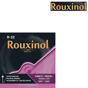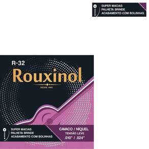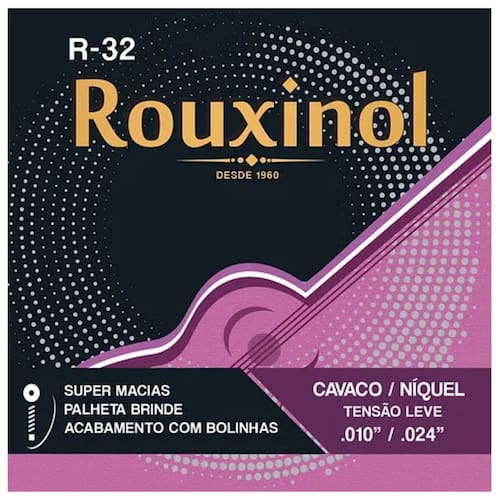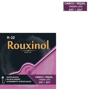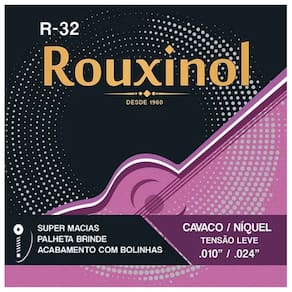 Encordoamento Cavaquinho Tensão Leve “0.24 R32 Rouxinol + BrindeAs cordas Rouxinol proporcionam um ótimo timbre para o seu cavaquinho com um excelente custo-benefício, trazem a mesma qualidade presente em todos os tradicionais produtos Rouxinol / Nig. O modelo R32, em especial, tem a “exclusiva ação macia”.São ótimas para vários estilos musicais brasileiros dando um bom e equilibrado timbre o seu cavaquinho.Tensão das Cordas: .010 - .012 - .018 - .024 (leve).Características:Acabamento com bolinhasPrimas: Aço inoxidável (não enferrujam).Super MaciasBordões: Alma de aço carbono estanhado, encapada com níquel.Itens Inclusos:1 Encordoamento Cavaquinho Tensão Leve “0.24 R32 Rouxinol 1 Palheta*Imagens Ilustrativas*