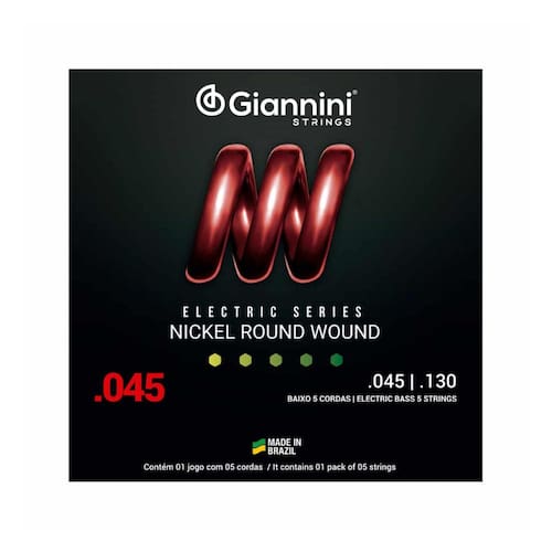 Encordoamento Giannini P/Contra Baixo Pesado 0.045 GEEBRS/5 A série Electric traz toda a sonoridade dos encordoamentos Giannini para a sua guitarra e contra-baixo. O encordoamento para baixo 05 cordas Giannini GEEBRS5 é composto de um núcleo de aço revestido por Níquel. O Níquel produz um som brilhante e agressivo que atende uma grande variedades de estilos musicais, sendo bem resistente a oxidação e corrosão. Jogo de 5 cordas para Contrabaixo.Marca: GianniniSérie: EletricFabricação: BrasilTensão: PesadoAlma: Aço