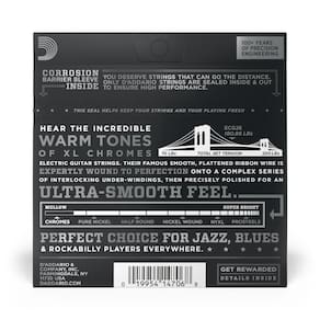 As cordas D Addario Chromes Flat Wound são as cordas "flat mais famosas do mundo, devido ao toque macio, cobertura lisa e ótimo som. Após o enrolamento, cada corda recebe 3 etapas de polimento, resultando numa superfície macia que faz das cordas Chromes a escolha ideal dos guitarristas de jazz e fusion. O timbre quente é ideal para o jazz, rockabilly e R&B.