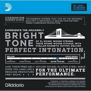 Encordoamento Guitarra Daddario 0.10 Exl110Corda para guitarra daddario exl110-b 0.10 + corda extraEncordoamento daddario exl110-b 010-046 guitarraAs exl110 são as mais vendidas na daddario. Proporcionam uma combinação ideal de timbre, flexibilidade e durabilidade. Um padrão para maioria das guitarras.As daddario xl nickel wound são reconhecidas mundialmente como a escolha dos grandes músicos, entre guitarristas de todos os gêneros e estilos. São feitas de aço banhado a níquel e enroladas com alta precisão ao redor de uma alma hexagonal, resultando em uma corda com inconfundível timbre brilhante e excelente afinação. Marca: d addario Modelo: exl110-b 1ª corda extra Mais durabilidade Preço e flexibilidade Timbre incomparavél Made in usa Itens inclusos 1 jogo de cordas