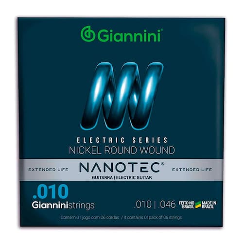 Todas as cordas da série Nanotec Electric contam com o protetivo Nanotec, bordões e primas. A série Electric traz toda a sonoridade dos encordoamentos Giannini para a sua guitarra e contra-baixo. O encordoamento para guitarra Giannini Nanotec GEEGST10 PN é composto de um núcleo de aço revestido por Níquel, produz um som brilhante e agressivo que atende uma grande variedades de estilos musicais, sendo bem resistente a oxidação e corrosão.