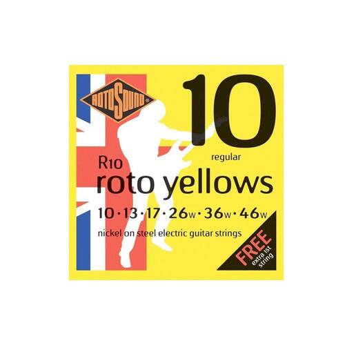Encordoamento guitarra rotosound r10 roto yellows 010 Encordoamento para guitarra rotosound r10 roto yellows 010 0.10 / 0.13 / 0.17 / 0.26w / 0.36w / 0.46w sobre as cordas grandes pioneiros na arte de fabricar suas cordas a rotosound tem uma incrível variedade de tipos e calibres de cordas feitos para todos os estilos de música durante décadas. Suas cordas têm em sua fabricação segredos originados de muitos testes e de muitos anos de estrada até chegarem na tecnologia das cordas fabricadas hoje principais características: mais brilho mais nitidez som mais quente e vintage