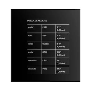 Prata MI (E) .011 (0,28 mm)Roxa SI (B) .014 (0,36 mm)Verde SOL (G) .018 (0,46 mm)Preta RÉ (D) .032 (0,81 mm)Vermelha LÁ (A) .042 (1,07 mm)Dourada MI (E) .052 (1,32 mm)