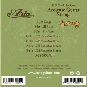 Encordoamento Para Violão Coated .011 Phosphor Bronze O Encordoamento Para Violão Coated .011 Phosphor Bronze AGS200CL da Aria Guitars é um modelo que conta com C.R.T. tratamento Resistente à Corrosão , um processo que protege as superfícies metálicas do contato com oxigênio e umidade. Ao combinar esse processo com os melhores materiais, trefilação precisa e revestimento, cada conjunto da série AGS C mantém o tom familiar das cordas sem revestimento, ao mesmo tempo que prolonga sua durabilidade.