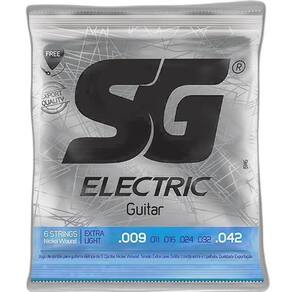 Encordoamento SG Guitarra 009 - 042 Encordoamento com tensão Extra Light, traz um timbre suave e pouco encorpado, com menor ganho nos agudos. É ideal para quem prefere aplicar menos tensão na tocabilidade, e mesmo assim tem um resultado limpo e brilhante, como por exemplo os estilos Soul, Blues e o Pop. Com um som rico em sustain, com ataque dinâmico, brilho nos médios e graves quentes, a linha níquel da SG com certeza é o que você precisa. Feita com material de primeira qualidade, as cordas de níquel apresentam a sonoridade mais equilibrada dentre os materiais utilizados para esta finalidade, alcançando desde um brilho extremo para o rock até um som mais encorpado, essencial para o jazz. Com uma ampla variedade muito grande de calibres, esta linha foi feita para trazer o máximo de conforto aos guitarristas mais exigentes. No processo de fabricação ainda existe todo um cuidado no armazenamento e manuseio dos materiais para que a durabilidade das cordas seja estendida. Medidas para uso em escala com comprimento de 25,5/ 648mm. Cordas primas em aço estanhado cilíndrico. Bordões com revestimento de aço niquelado NPS e núcleo hexagonal de aço estanhado. Especificações: Marca: SG Instrumento: Guitarra Tensão: 009 Contém 1 Corda Mizinha Bônus e 1 Palheta. Tensões de todas as Cordas: E1 B2 G3 D4 A5 E6 .009 .011 .016 .024 .032 .042 Ean: 17897626851457