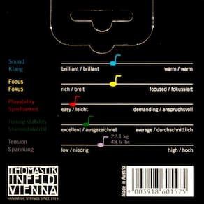 Composição: - Corda MI - Aço Inoxidável revestido em Titanium - Corda La - Núcleo Sintético revestido em Hidronálio - Cordas Re e Sol - Núcleo Sintético revestido em Prata 99.9