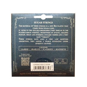 Encordoamento ukulele aquila aq150sh sugar s. Soprano high g Descrição do produto: - as cordas aquila sugar ukulele são feitas com um bio-plástico derivado da cana-de-açúcar que foi descoberto recentemente na itália. - o som dessas cordas é claramente brilhante , limpo e rápido . - ao contrário das cordas de fluorocarbono, as cordas de açúcar têm um vibrato excelente e uma variação significativa de timbre ao mudar a posição da mão direita de perto da ponte para sobre o orifício de som. - em outras palavras, em seus extremos, eles contêm a doçura e a melodia do nylon e o brilho e rapidez típicos do fluorocarbono. - outra propriedade importante é a característica sustain, que por medidas científicas é superior a qualquer tipo de corda atualmente disponível no mercado. - outra característica que foi medida é a potência sonora : nossos testes científicos mostraram que ela é superior à das cordas de fluorocarbono. - embora a superfície seja extremamente lisa, o controle sobre os dedos é notável.