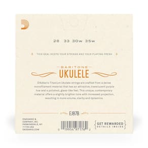 O encordoamento EJ87B para ukulele barítono é composto com a Pro-Arté Titanium nas cordas primas E e B, combinadas com a Pro-Arté Nylon Core nas cordas bordões G e D. A resposta de harmônicos da Pro-Arté Titanium resulta em um timbre brilhante, proporcionando a sonoridade desejada pelos músicos e que os amantes do Ukulele tanto procuram.?