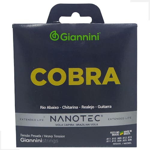 O encordoamento Giannini Nanotec Cobra Níquel GESVNP PN é ideal para afinação Rio Abaixo, Chitariana, Realego e Guitarra, tensão pesada.
