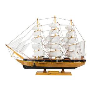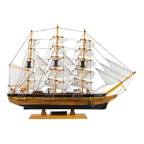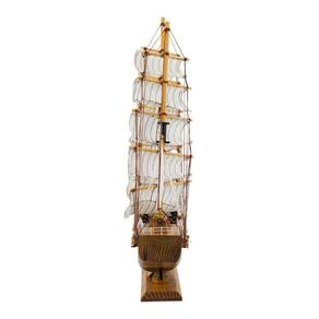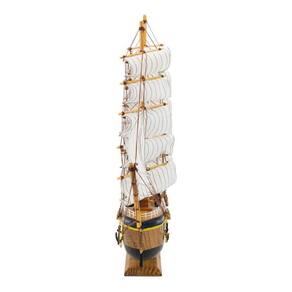 Enfeite no formato de miniatura de barco navio veleiro com 48 cm de altura, 10 cm de largura e 69 cm de comprimento. Modelo se destaca com o casco do navio na cor madeira com base na cor preta. Vem com suporte para ficar em posição e afixado com placa com nome de Fraghta Sigio XVII. Material: madeira; Função exclusivamente decorativa