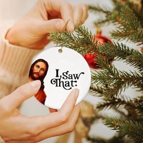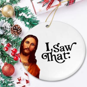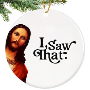 -?Eu vi aquele enfeite de Jesus?Este enfeite de Natal humorístico apresenta a frase engraçada “Eu vi isso” com um Jesus engraçado, tornando-o perfeito para presentes engraçados de Jesus e troca de presentes de Natal para adultos. Com certeza trará risadas e alegria às suas comemorações de fim de ano. Ideal, eu vi aquele enfeite de Jesus, enfeite engraçado de Jesus, eu vi aquele signo de Jesus, enfeites de Jesus para árvore de Natal, enfeites de Jesus, eu vi aquele Jesus