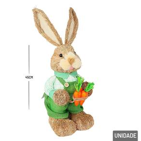 Enfeite de Páscoa Coelho de Palha com Cenour O Enfeite de Páscoa Coelho de Palha Decorado carregando Cenoura em sua Pata, é uma peça encantadora que traz todo o charme e a alegria da Páscoa para sua decoração. Com 45cm de comprimento, este Enfeite combina o tradicional com o lúdico, criando uma atmosfera acolhedora e divertida para o seu lar durante as festividades.\nO coelho de palha é cuidadosamente confeccionado com materiais naturais, proporcionando um visual rústico e charmoso, típico de decorações de Páscoa mais aconchegantes.\nO coelho é vestido com roupinhas delicadas e apresenta uma expressão adorável, transmitindo a doçura e a leveza da celebração. Ele é ideal para decorar diferentes ambientes da sua casa, como a entrada, estantes, mesas ou prateleiras, e com seu tamanho generoso, chama a atenção de forma encantadora, sendo um verdadeiro destaque na sua decoração de Páscoa.\nDisponível em cores.\nEspecificações:\nMarca : TINGS\nTipo de material : Fibra Natural, Isopor, Palha, Poliéster\nCores ou Estampa : Color\nDimensões do Produto : 45 X 18 X 14 CM\nDimensões da Embalagem : 45 X 18 X 14 CM\nPeso Bruto (Gramas) : 0.180 Marca: Não Informado
