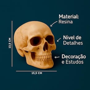 Enfeite Decorativo Cabeça Crânio Caveira Realista Extra Grande 13CM Presente Halloween Anatomia Óssea Destaque sua decoração com os Enfeites de Crânio Humano em Resina - peças que combinam realismo, acabamento refinado e versatilidade para diversos ambientes. Ideais para composições góticas, temáticas de Halloween, vitrines criativas, consultórios alternativos ou até mesmo como objeto de estudo decorativo. Produzidos em resina de alta qualidade, esses crânios impressionam pelo nível de detalhe, inclusive nas versões menores. São perfeitos para composições individuais ou em série. A coloração bege fosca simula ossos reais, oferecendo um visual impactante com toque artesanal. Benefícios: Alta fidelidade anatômica, mesmo nos modelos menores Acabamento detalhado e resistente Ideal para ambientes temáticos, Halloween ou consultórios Produto leve, durável e fácil de posicionar Especificações Técnicas: Material: Resina Cor: Bege única Tamanho: Altura: 13,5cm / Largura: 6cm / Comprimento: 15,5cm Acabamento: Detalhado artesanal : 90 dias para defeitos de fabricação Cuidados e Conservação: Limpar com pano seco Evitar exposição direta à umidade extrema Manter em ambiente arejado para preservar o acabamento Garanta já o seu Decore com personalidade, impacto visual e qualidade superior. Cada peça é única e feita para impressionar. Marca: Não Informado