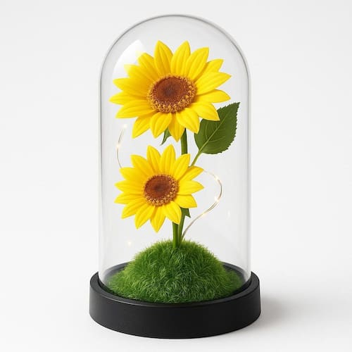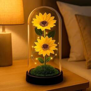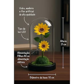 Enfeite decorativo Modelo Cúpula de Vidro e Base em madeira com Girassol Permanente Transforme momentos especiais com a Luz LED Flor Eterna Girassol. Esta luminária combina delicadeza e elegância, perfeita para surpreender quem você ama. Com cúpula de vidro transparente e base de madeira, exibe um belo girassol iluminado por luzes LED, criando um ambiente acolhedor e romântico. Ideal como presente de aniversário, Dia dos Namorados ou decoração de ambientes. Benefícios detalhados: Girassol permanente com acabamento artesanal. Iluminação LED suave, ideal para criar atmosfera aconchegante. Cúpula de vidro que protege e valoriza a flor. Base de madeira com acabamento clean. Presente criativo e marcante para ocasiões especiais. Especificações Técnicas: Material: Vidro, madeira e flor artificial de alta qualidade. Tipo de luz: LED Alimentação: Pilhas AA ou alimentação elétrica, conforme variação Altura aproximada: 21 cm Diâmetro da base: 10 cm Cor: Girassol amarelo com iluminação quente Dicas de uso e conservação: Ideal para uso decorativo em mesas de cabeceira, salas, escritórios ou presentes românticos. Evite expor diretamente ao sol ou umidade para preservar a estética. Limpeza com pano seco e macio. e segurança: Marca: Não Informado