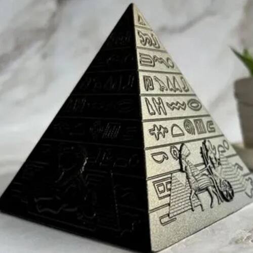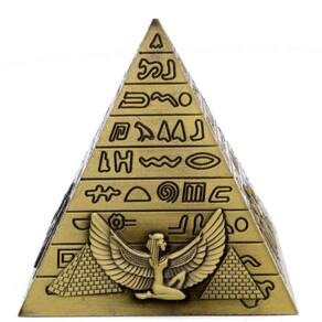 Enfeite Pirâmide Estátua Egito Decoração Escultura Metal Pirâmide Egípcia Enfeite Decoração Este item apresenta quatro faces, cada uma com um padrão distinto. Cria uma atmosfera misteriosa e de época. Produzido em metal com tonalidade Ouro Velho.