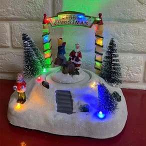 O Parque Gangorra Natalino Natal utiliza 3 pilhas AA (NÃO Inclusas) ou Cabo USB (Não acompanha adaptador de tomada)
