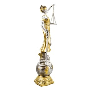 Este é um enfeite decorativo autêntico, representando a Dama da Justiça na cor dourada, posicionada sobre um globo. A peça, produzida pelo fabricante Taimes, tem uma altura total de 41 cm. O material utilizado na sua fabricação é a resina, que confere à peça uma resistência e durabilidade excepcionais. As dimensões da peça são de 11x11x41 cm, tornando-a uma peça de tamanho considerável que certamente chamará a atenção em qualquer ambiente. O peso da peça é de 620 gramas, o que a torna fácil de manusear e posicionar. O modelo é a Dama Da Justiça No Globo Resina Têmis Deusa Direito 41 Cm, uma representação artística da deusa da justiça, Têmis. A temática da escultura é a Dama da Justiça, um símbolo universal de justiça e equidade. Esta é uma peça decorativa, perfeita para decorar escritórios de advogados, salas de tribunal ou mesmo a sua casa. A peça vem com uma base, o que facilita a sua colocação em qualquer superfície plana.