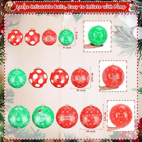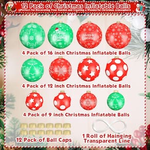 O pacote inclui: - 12 bolas infláveis - 12 bonés de enfeite - 1 cordão transparente para pendurar - pacote com 12 bolas de Natal infláveis: o kit grande de enfeites de Natal Flasoo vem com 12 bolas infláveis, 12 bonés de enfeites, 1 cordão transparente. Ótimo para decorar sua casa e pátio para um visual festivo! - REUTILIZÁVEIS E DURADOUROS: os enfeites infláveis são feitos de PVC impermeável de alta resistência que é durável para uso prolongado. Você pode esvaziá-los e embalá-los para facilitar o armazenamento e o uso no próximo ano! - TEMA DE NATAL E VÁRIOS TAMANHOS: Os infláveis de Natal estão em 3 tamanhos diferentes: 9 polegadas, 12 polegadas e 16 polegadas, 4 pacotes para cada tamanho. Eles vêm em diferentes padrões e cores de Natal. Bolas de Natal de tamanho grande em cores vivas são a melhor escolha para decorar seu quintal e sua casa! - RÁPIDO E FÁCIL DE MONTAR: Não são necessários procedimentos complicados de montagem, tudo o que você precisa fazer é inflar a bola com uma bomba, colocar a corda e colocar o metal em uma tampa de metal e, em seguida, um lindo enfeite de Natal grande está completo! - DECORAÇÃO INTERNA E EXTERNA: Nossas decorações de bolas infláveis são ideais para árvores ao ar livre, pátios, gramados, varandas, jardins, portas dianteiras, piscinas ou janelas, e você também pode usá-las como decoração para festas de inverno e festas temáticas de Natal.