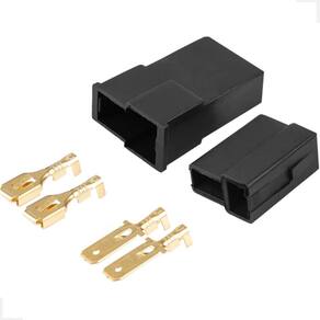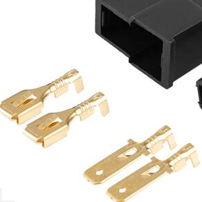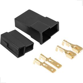 O conector possui 2 vias e apresenta terminais de encaixe. A composição é em ABS e os terminais são feitos de latão. O ABS proporciona alta resistência a impactos e ao calor e o latão é um ótimo condutor de calor e energia.