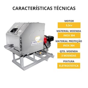 Material do Corpo: Aço Carbono Material das Moendas: Inox 304 Antiferrugem Material da Proteção: Inox 304 Antiferrugem Quantidade de Moendas: 3 Pintura: Eletrostática para Maior Durabilidade Capacidade: 200L/H Motor: 1,5cv 127v