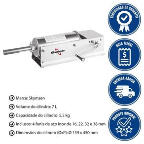 É importante desmontar o cilindro, o pistão e os bicos para limpeza completa, evitar produtos abrasivos, secar as peças imediatamente após a lavagem, e aplicar lubrificante alimentar nas partes móveis conforme as recomendações do fabricante. Capacidade em volume: 7 L | Material: Aço Inoxidável | Quantidade de funis: 4 | Funis incluídos: 4 | É kit: Sim | Capacidade em peso: 5.5 kg | Voltagem: Sem voltagem | Diâmetro dos funis: 16 mm, 22 mm, 32 mm, 38 mm | Altura: 19 cm | Largura: 18.5 cm | Profundidade: 84.5 cm | Peso: 13.60 kg | Pressão máxima: | Inclui Braçadeiras: | EmbalagemAltura-cm: 39 | Dias Fornecedor: 0 | Modelo: EL7 Horizontal Inox 7 Litros 707139 | Cubagem: 0.135720 | EmbalagemComprimento-cm: 87 | Peso Líquido: 0.0000 | EmbalagemLargura-cm: 40 | Marca: Skymsen