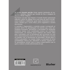 Os escritos chamados apócrifos foram aqueles destituídos de autoridade canônica. Aqueles que ficaram de fora, à margem do discurso oficial, religioso.Em Ensaios apócrifos Ana Gianesi e Conrado Ramos apresentam reflexões a partir do diálogo livre com textos deautorxsde diferentes tradições e militâncias, quais sejam: feminismos, antirracismo, estudosqueer, teoria crítica, povos originários e estudos descoloniais.O caminho é fragmentário e constelar porque corresponde ao percurso aberto de aprendizagem dos autores que, como psicanalistas lacanianos, perceberam a necessidade de frequentar territórios muitas vezes considerados avessos nos corredores institucionais. De maneira pouco habitual eles tentam olhar para a psicanálise com as ferramentas que encontram em seus novos atravessamentos teóricos ao invés de olhar para as teorias em questão com as ferramentas da psicanálise. Resulta disso a crítica à psicanálise e ao mesmo tempo a construção de novas possibilidades clínicas que, defendem os autores, seguem sendo psicanalíticas, porém, sem os ranços conservadores com os quais a vestem os ainda salvacionistas do pai. Ean: 9786555065770