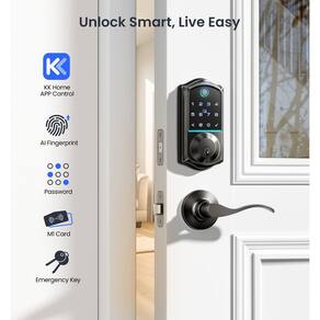 O conjunto de fechadura inteligente VE017-L da Veise oferece acesso flexível com opções de impressão digital, aplicativo, senha, cartão e chave. Você pode desbloquear com vários métodos, incluindo bloqueio automático, pressionar qualquer tecla, reconhecimento de impressão digital ou usar o aplicativo. Com o aplicativo KK Home, você pode gerenciar permissões, registrar eventos e definir diferentes tipos de senha. Ele também inclui recursos como instruções de voz, proteção de senha anti-peep, alertas de tentativa e erro, modo de férias e modo silencioso. Depois de conectar ao Gateway G1 (vendido separadamente), você pode controlar seu bloqueio remotamente e usar comandos de voz através da Alexa ou Google Home. Mantenha-se atualizado com notificações em tempo real e monitore a atividade do seu cadeado e o status da bateria.