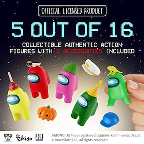 Obtenha um conjunto completo de figuras Among Us para brincar, iniciar uma coleção ou fazer uma festa temática AmongUs! ? Várias seleções de companheiros de tripulação: 5 figuras em 1 pacote 3 acessórios incluídos 1 figura está escondida (o impostor!): abra o pacote para descobrir qual personagem é as figuras vêm em cores diferentes e com chapéus diferentes uma figura é o impostor roxo com dentes afiados e a língua saindo você pode até encontrar o corpo morto (denuncie!) ? Esses mini brinquedos são colecionáveis: coletar o total de 16 personagens encontrar os personagens usando os chapéus mais legais novos e clássicos: o Rei Vi, o Descascado, o Entupido e o Tumulto encontrar os quatro companheiros de tripulação mais raros: o companheiro de tripulação vestindo o Punkin (roxo), o que usa o Flamingo Flutuante (ciano), o que usa o Chop-chop (vermelho) e o que corre usando o Grande Goalie (ou a máscara Jason?) (limão) uma figura em cada pacote está escondida, então coletá-los é uma missão! ? Use esses brinquedos como decorações e suprimentos de festa Among Us que as crianças adoram brincar com esses brinquedos / figuras Among Us juntos inspiram as crianças a ter partidas off-line, descobrindo qual é o impostor