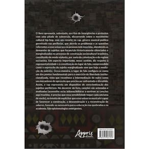 O livro apresenta, sobretudo, escritas de insurgências e protestos com uma pitada de subversão, discorrendo sobre o movimento cultural hip-hop, com um recorte no rap, gênero musical-poético germinado nas periferias, que aborda os problemas e as questões referentes a esse universo e às pessoas nele inseridas, atendendo as demandas de sujeitos que foram/são historicamente silenciados e marginalizados no processo de construção sociocultural brasileiro, constituído de modo violento, por meio da colonização e do regime escravista. Um aspecto importante, nesse sentido, diz respeito à representatividade e à constituição do lugar de fala, compreendido como a expressão do sujeito marginalizado sem que haja a mediação de outro(s). Dessa maneira, o lugar de fala con?gura-se como um dos pontos fundamentais para o exercício da liberdade institucionalizada, visto que reconhece a intermediação do outro como um mecanismo de opressão que precisa ser enfrentado e discutido. Assim, o rap representa um dispositivo de conscientização dos sujeitos periféricos. No decorrer do livro, canções são acionadas e analisadas (aconselho os/as leitores/leitoras a ouvirem as canções aqui trazidas, é preciso que essa sensibilidade toque cada um/uma de vocês), no intuito de explicitar que esse universo musical é capaz de favorecer a construção, a desconstrução e a reconstrução de saberes, fazendo-se necessário para a educação nas quebradas e na academia. São epistemologias emergentes.