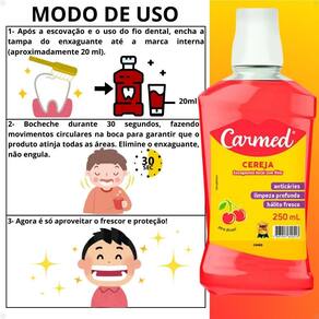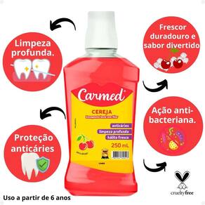 O Enxaguante Bucal Carmed Cereja oferece uma experiência única de frescor e cuidado para sua boca, combinando a proteção bucal com o sabor doce e agradável de cereja. Sua fórmula com flúor auxilia na prevenção de cáries, combate a placa bacteriana e mantém o hálito fresco por mais tempo. Ideal para o uso diário, o produto não contém álcool, proporcionando uma sensação suave e sem ardência. A embalagem de 250ml é prática, perfeita para o uso em casa ou para levar na bolsa. Com o Enxaguante Bucal Carmed Cereja, você garante uma boca limpa, saudável e com um frescor duradouro.