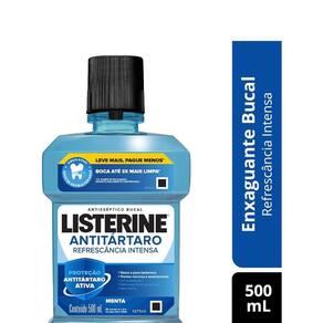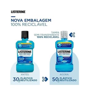 Enxaguante Bucal Listerine Tartar Control - 500ml Brand LISTERINE Laboratorio LISTERINE Controlado NãO Especificacao EXAGUANTE BUCAL Enxaguante Bucal Listerine Tartar Control - 500mlA escova e o fio dental alcançam apenas 25% da cavidade bucal. Para uma limpeza 100% eficaz, complete sua rotina com LISTERINE Antitártaro. Este enxaguante bucal elimina até 99,9% dos germes Responsáveis por:Mau hálitoFormação de placa bacterianaGengiviteAcúmulo de tártaroTecnologia Avançada AntitártaroFormulado com cloreto de zinco, LISTERINE Antitártaro oferece:Proteção contra a formação de tártaroPrevenção de manchas e amarelamento dentalAção antibacteriana prolongadaPrincipais BenefíciosPrevine a formação de tártaroReduz significativamente a placa bacterianaMantém os dentes naturalmente brancosProteção por até 24 horasElimina até 99,9% dos germes causadores de problemas bucaisFórmula exclusiva com 4 agentes antibacterianosProduto 100% reciclável frasco e tampa 50% de plástico reciclado na embalagemModo de Uso CorretoUse 20mL copo dosador incluso Faça bochechos por 30 segundosUtilize 2 vezes ao dia após escovação e fio dentalNão diluirProteção de 24 horas com uso a cada 12 horasGermes causadores de mau hálito, placa, gengivite e tártaroPrecauções ImportantesNão usar em menores de 12 anosNão engolirEm caso de irritação, suspenda o uso e consulte um dentistaLimite de uso: 2 vezes ao diaArmazenar em local fresco e secoEvitar contato com os olhosNão indicado para pessoas com hipersensibilidade aos componentes Marca: Não Informado Ean: 7891010256791