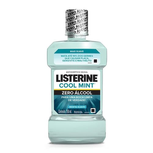 Listerine Cool Mint Zero Álcool é um enxaguatório bucal de uso diário, com eficácia clinicamente comprovada. Utilizado após a escovação, elimina até 99% estudo in vitro das bactérias que causam a placa e atua em lugares onde a escovação e o fio dental não alcançam. Benefícios: Possui fórmula sem álcool; Ajuda a eliminar as bactérias que causam mau hálito, gengivite e placa. Modo de usar: 1 Deve ser utilizado duas vezes ao dia, depois de escovar bem os dentes e de usar o fio dental; 2 Use 20ml por enxágue; 3 Bocheche por 30 segundos; 4 Use sem diluir e não engula. Precauções: Não utilize o produto em crianças menores de 6 seis anos de idade. Composição: Óleos essenciais específicos de Listerine; Thymol, Eucalyptol, Menthol, Methyl salicylate. Proc. 25351.463254/201718 Ean: 7891010973902