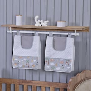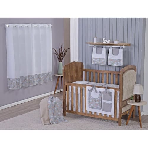 Contém na embalagem: 1 lençol com elástico 1,30m comp x 0,70m larg x 0,15m alt 1 lençol sem elástico 1,35m comp x 1,05m larg 1 fronha 40cm comp x 30cm larg 1 manta dupla face 1,15m comp x 0,95m larg manta de microfibra na cor bege de um lado e tecido de algodão do outro 2 porta fraldas 43cm alt x 32cm larg x 10cm prof para ser pendurado em varão em móveis ou na parede 1 porta treco 64cm larg x 54cm alt para ser pendurado em varão ou no berço 1 cortina 2,70m larg x 1,60 alt 2 partes de 1,35m larg