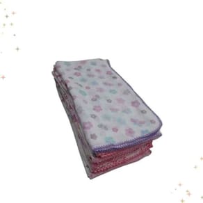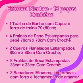 Especificações do Kit FEMININO: Total de Produtos: 15 Peças Contém 1 Toalha de Banho com Capuz e forro de fralda 70x80cm Contém 4 Fraldas de Pano Estampadas para Bebê 70cm x 70cm Com Crochê Contém 2 Cueiros Flanelados Estampados para Bebês 80cm x 80cm Com Crochê Contém 5 Fraldas de Boca Estampadas para Bebê 33cm x 33cm Com Crochê Contém 3 Babadores Minasrey Impermeais com forro e fechamento de amarrar