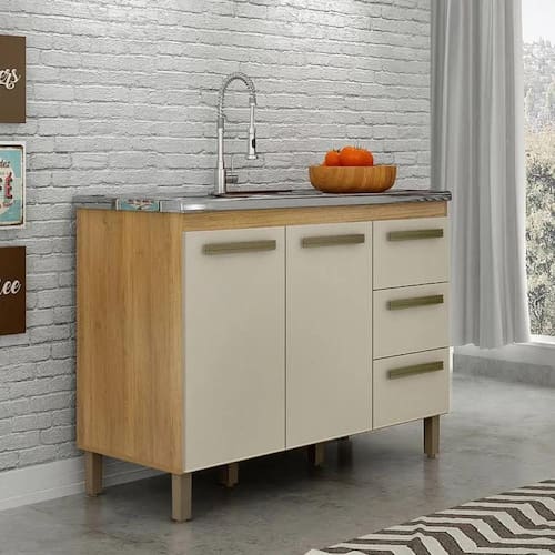 Praticidade e facilidade são os principais pontos do Balcão Pérola Feito em MDP nas cores marrom Cinamomo com Off White. Possui 2 portas, 3 Gavetas e 1 Prateleira. NÃO ACOMPANHA PIA. Complementando sua cozinha e trazendo versatilidade para organizar sua cozinha com encanto!